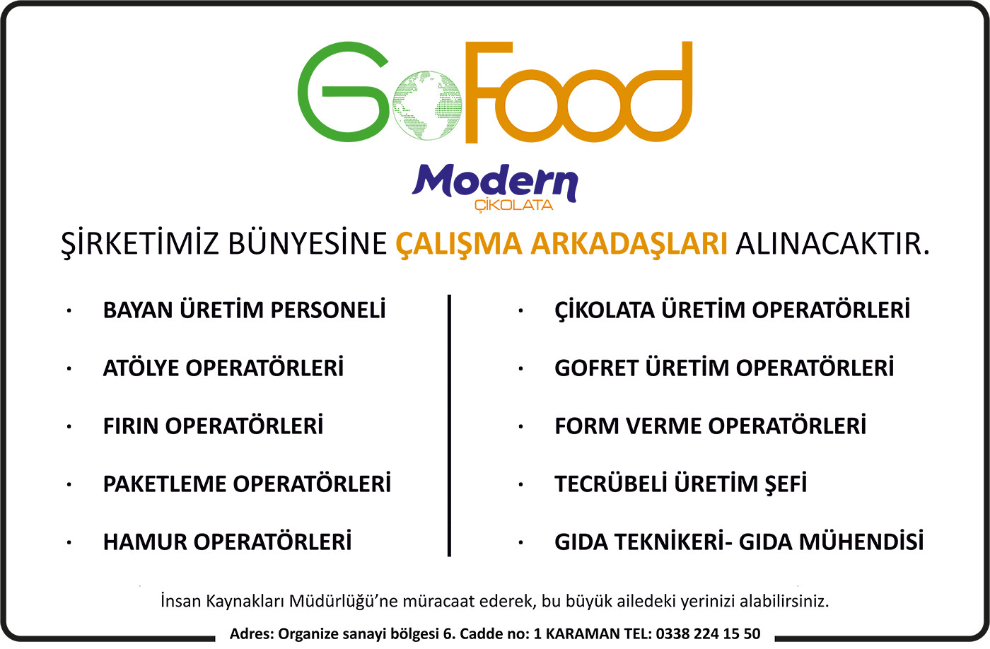 Başvuruların, GoFood Modern Çikolata İnsan Kaynakları Müdürlüğü’ne şahsen yapılabileceği belirtildi. Firma yetkilileri, “Büyük ailemize katılmak isteyen herkesin başvurularını bekliyoruz.” açıklamasında bulundu.